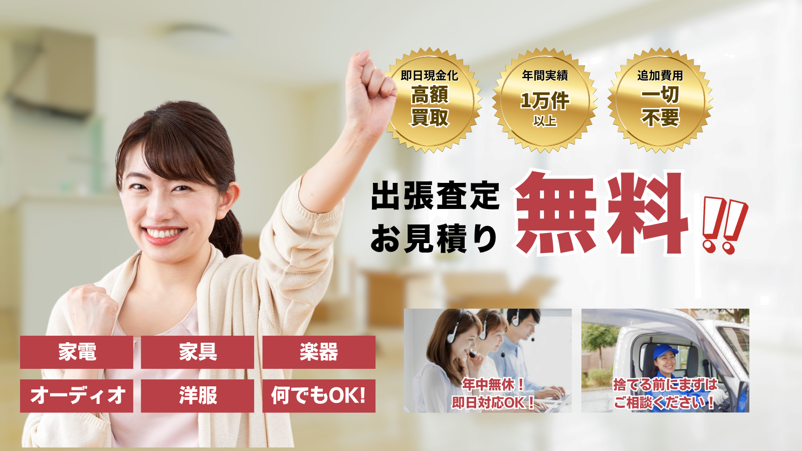 引っ越しや片付け、断捨離などで出た不要品の査定・買取も、各市までスタッフがお伺いします。